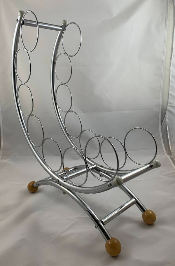 Metalen wijnrek uit de jaren '70.Plaats voor minimaal 7 flessen maar je kunt het ook gebruiken voor tijdschriften of handdoeken. Het rek staat op houten bolletjes.Afmetingen: 55 cm hoog, 48 cm breed, 16,5 cm breed.
