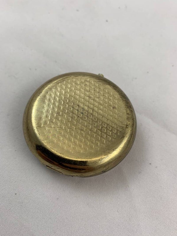 Rond vintage koperkleiring pillendoosje (Pill Box) met vervaagde afbeelding meisje met hoed, jaren '70. Het doosje heeft drie compartimentjes.
