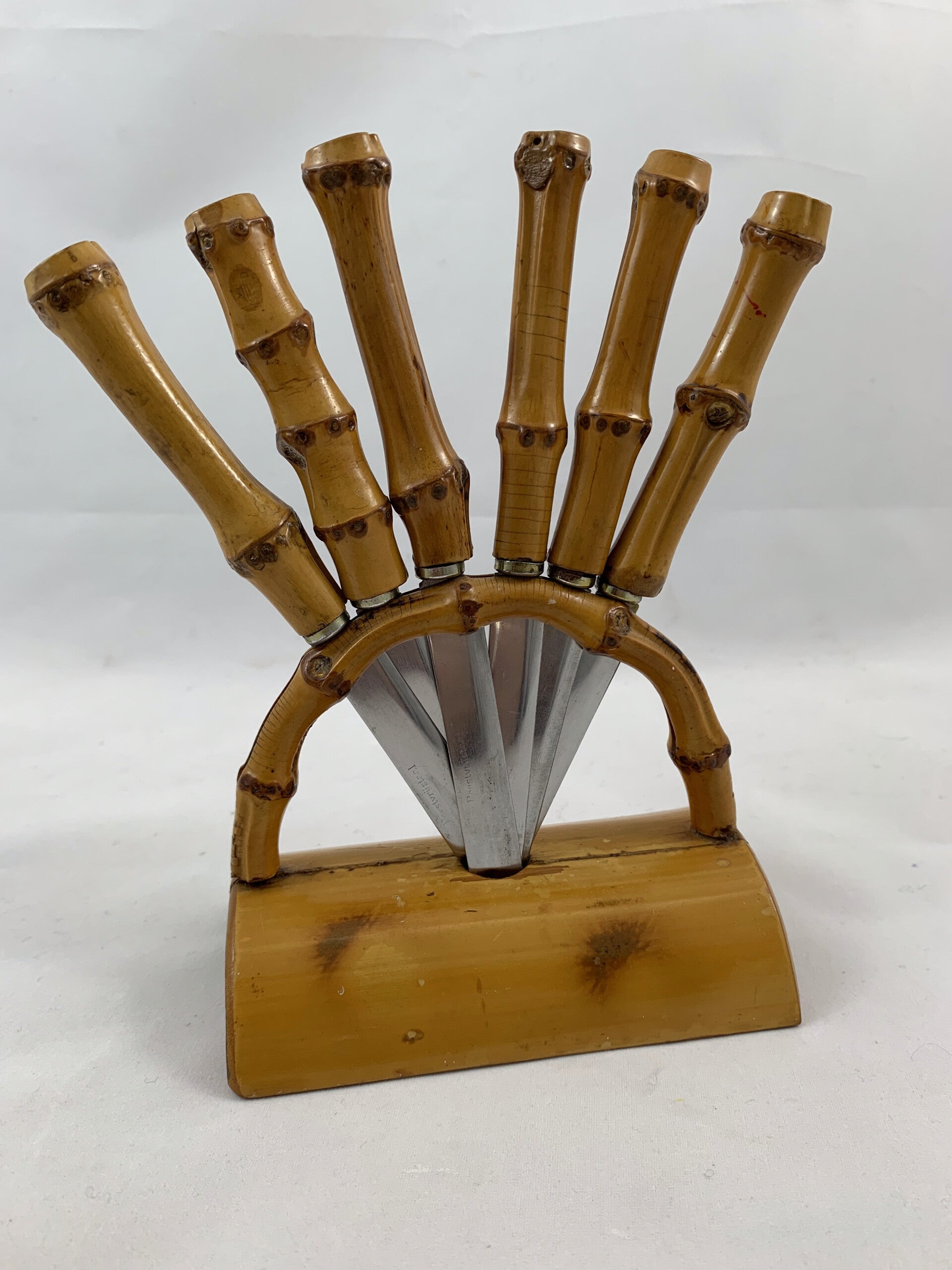 Vintage bamboe messenhoudertje met 6 roestvrijstalen kaasmesjes uit de jaren 70.