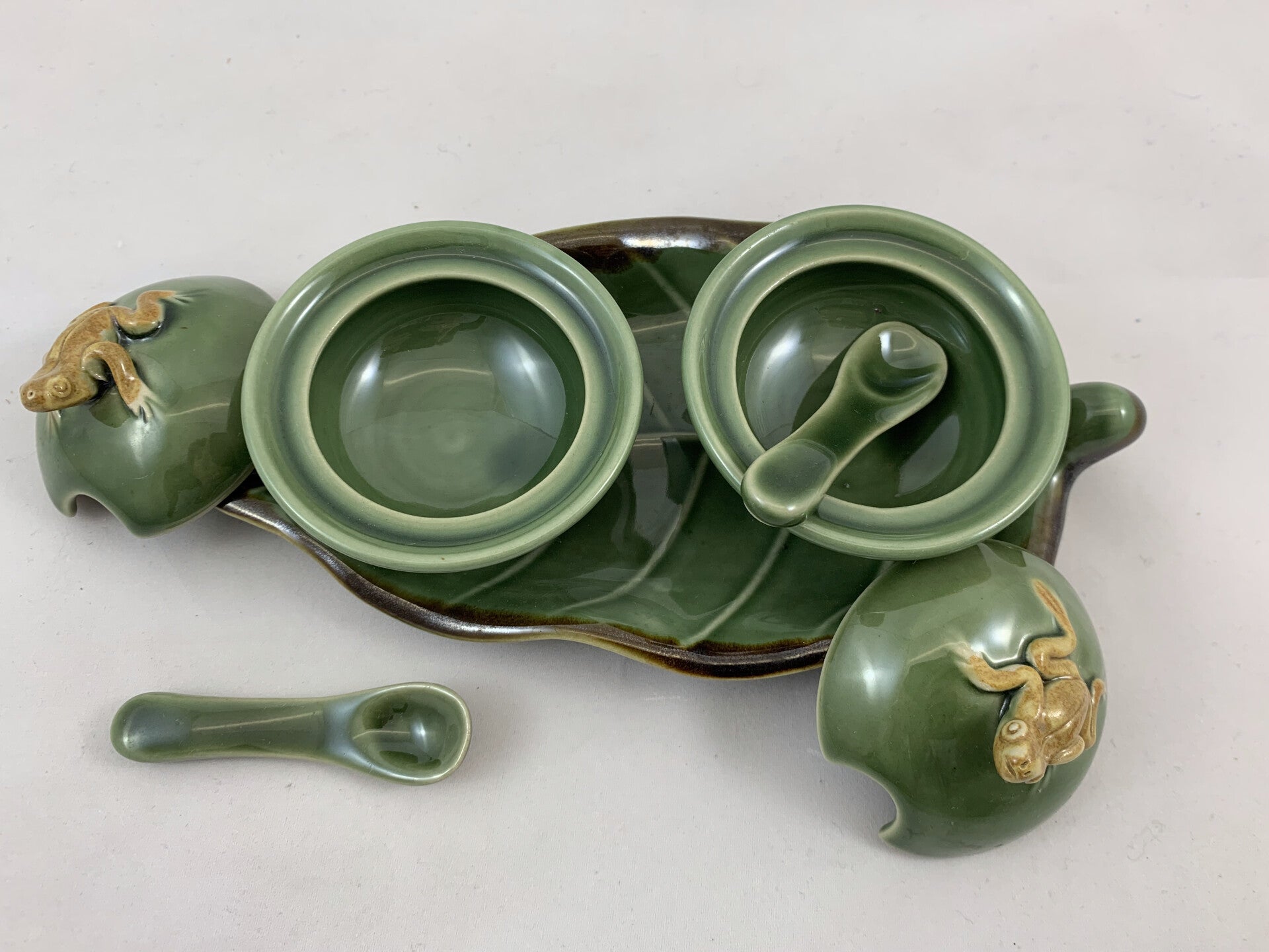 Balinese keramieken kruidenpotjes met kikkers op blad, jaren '70-'80