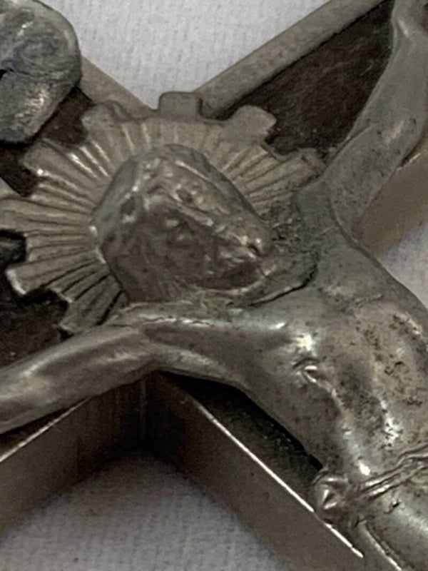 Het kruis heeft aan de voorzijde de afbeelding van Jezus Christes aan het kruis genageld, een doornkrans en een schedel met botten. Aan de achterkant een heilig hart met zwaard.