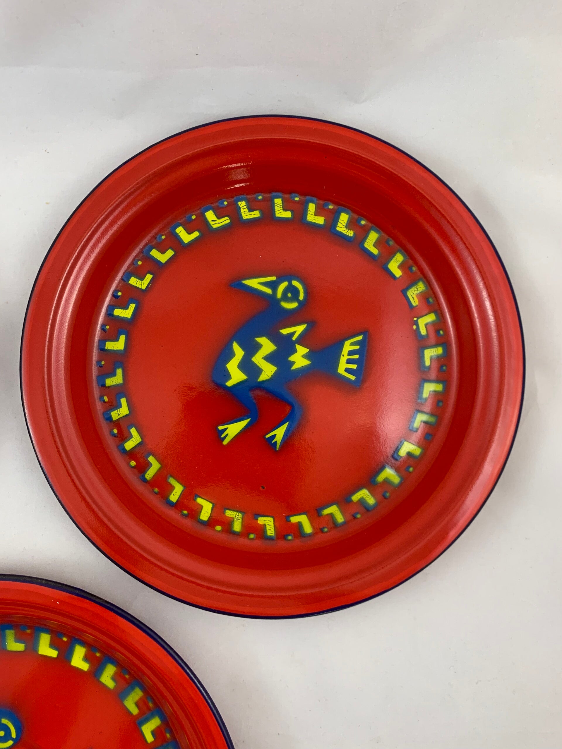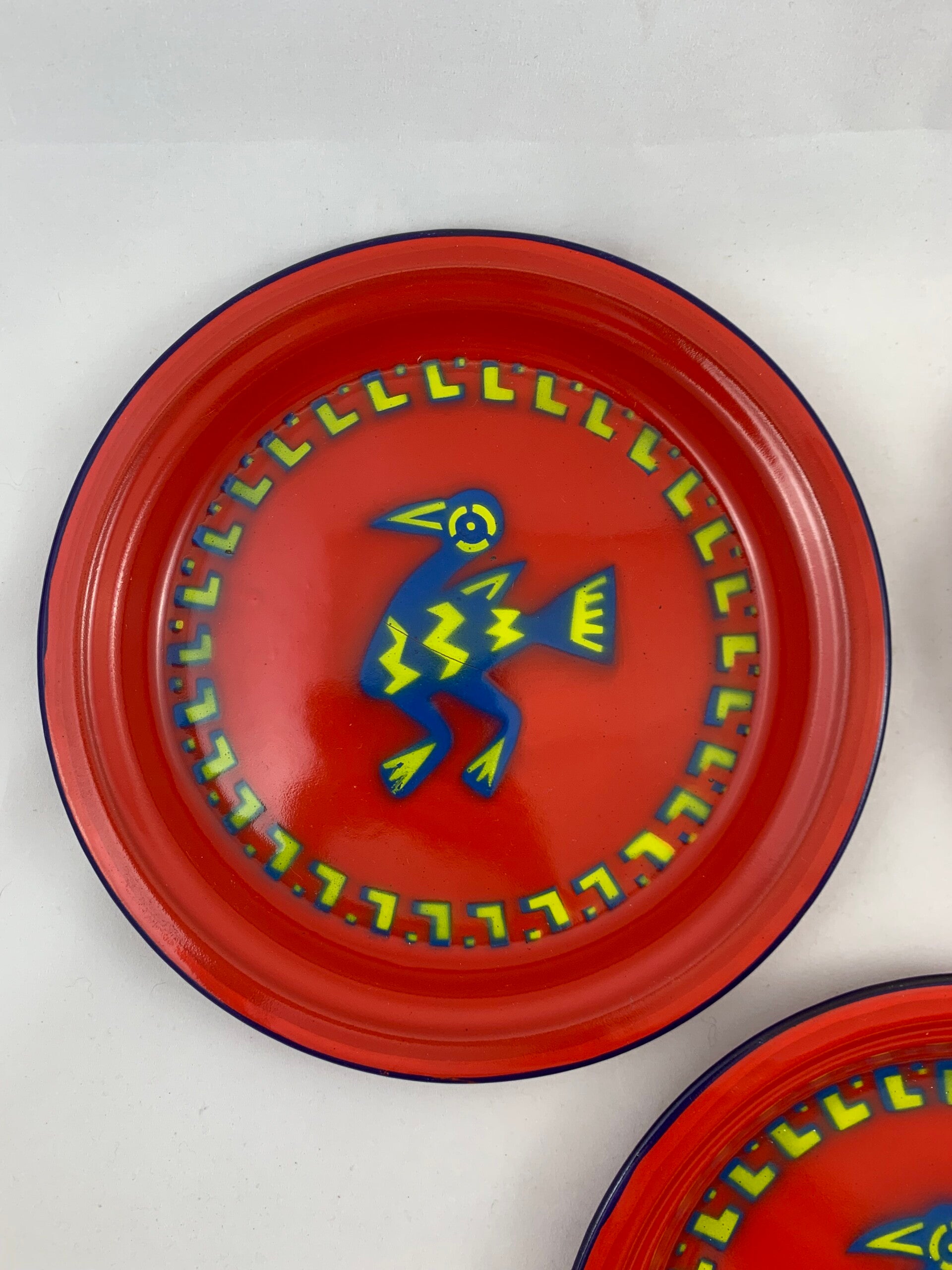 De kleuren zijn blauw, geel en rood. Het vogelmotief staat centraal in een band met geel-blauw L-vormig patroon. De buitenrand is blauw en de borden zijn rood aan de achterkant. De prijs is voor de drie borden samen.