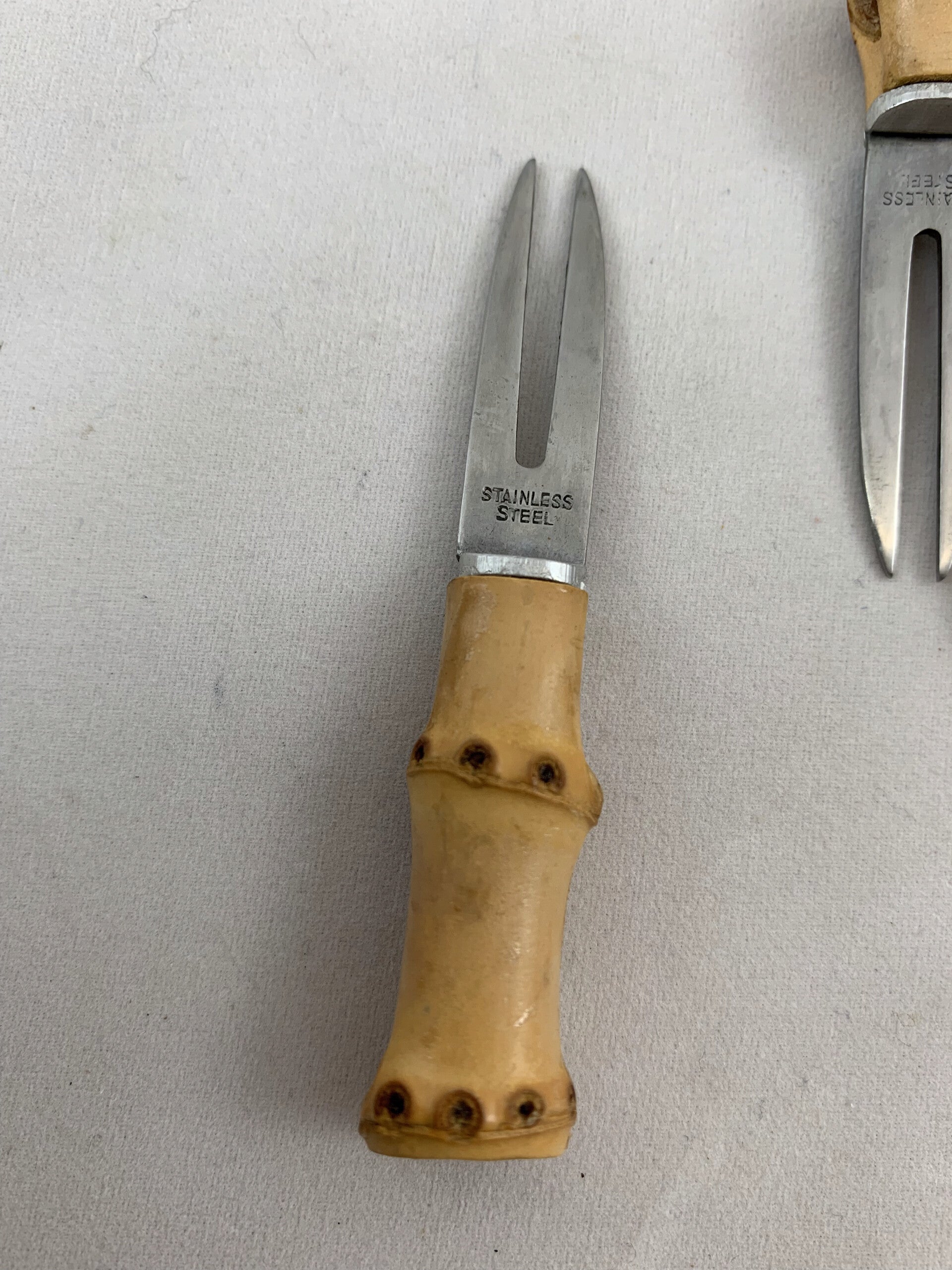 Elk stammetje heeft ruimte voor 6 vorkjes. Die zijn gemaakt van bamboe en staal. Elk vorkje is gemerkt met STAINLESS STEEL (roestvrij staal). De stammetjes en vorkjes zitten in hun originele doosje met rood dekseltje. Twee hoekjes en één kantje aan de binnenzijde vertonen hun leeftijd. Vermoedelijk gemaakt in Japan.