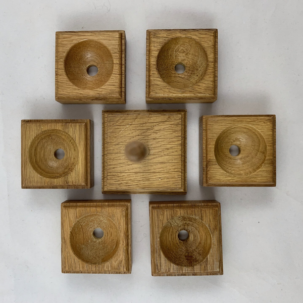 Setje van 6 eikenhouten eierdopjes op een standaardje. De vintage dopjes zijn gemaakt door Meubelfabriek Oisterwijk welke bekend stond om hun goede kwaliteit.