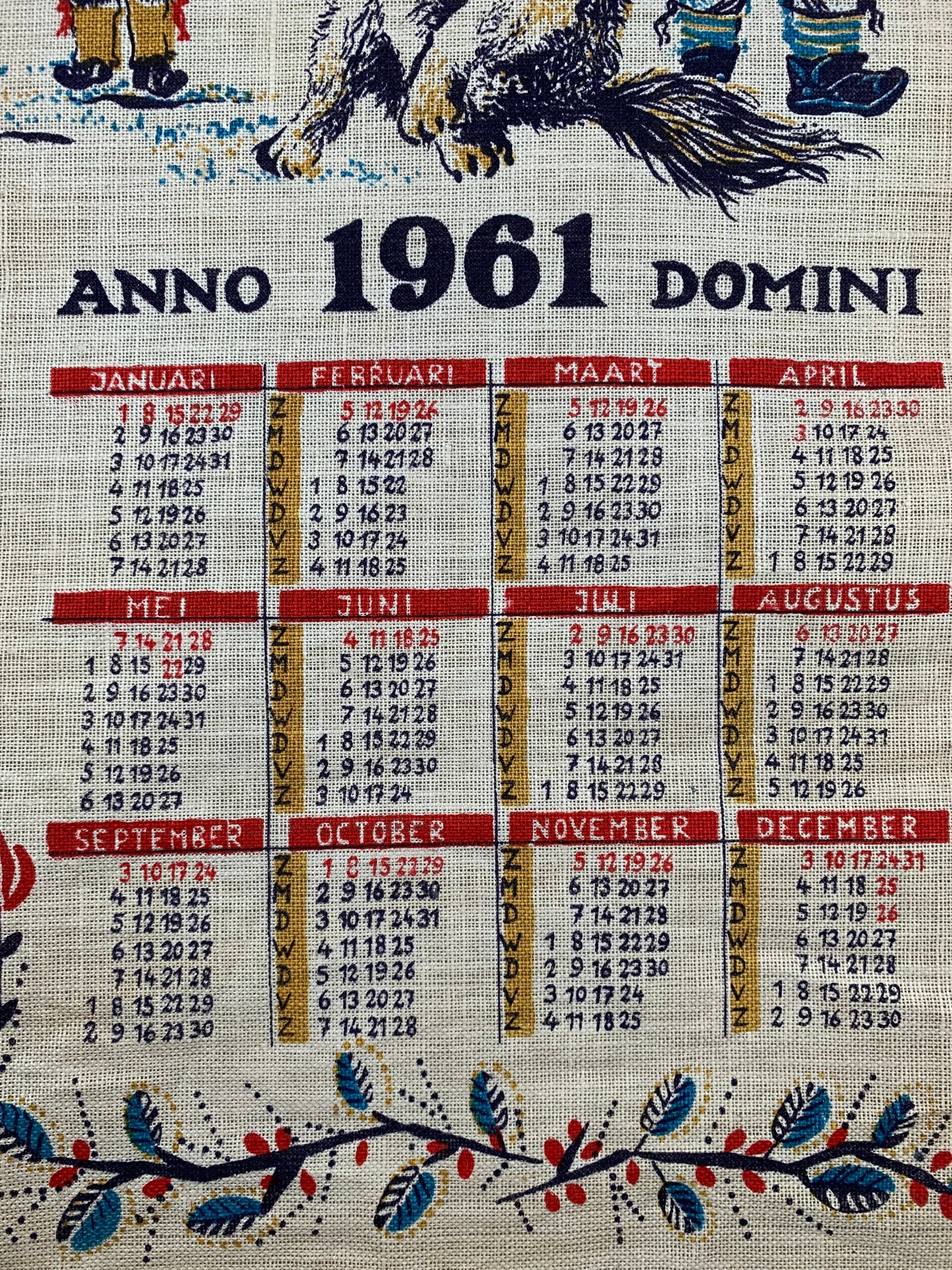 Vintage kalenderhanddoek met illustraties in Inuit-kunststijl. De kalander is uit 1961. De afbeeldingen hebben nog steeds een levendige kleur en alles is prima in orde.