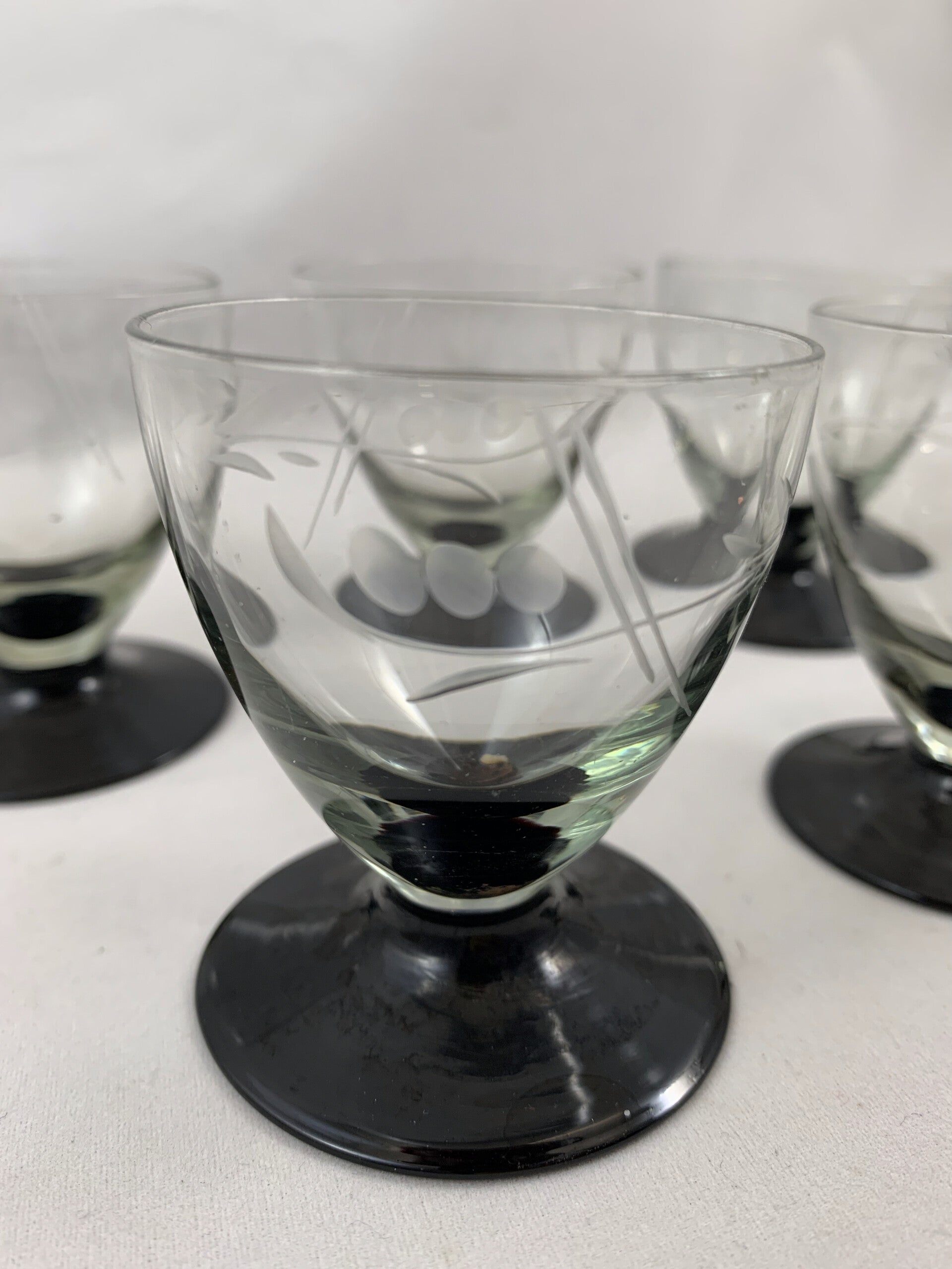 Vijf vintage Art Deco hand gegraveerde likeurglaasjes op zwart voetje, jaren '30