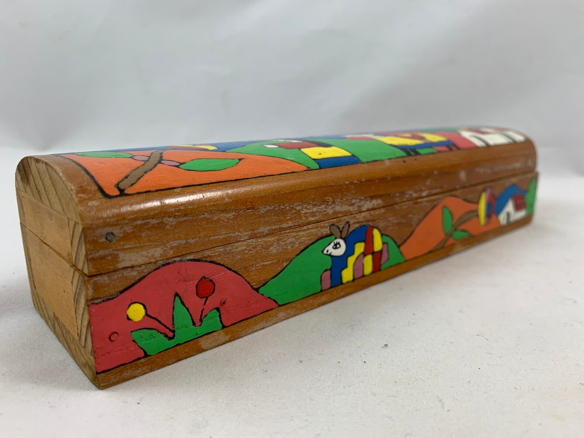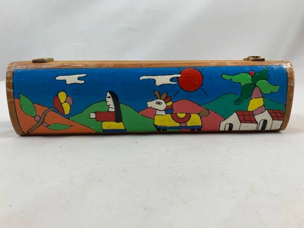 Het kleurrijke handgeschilderde volkskunst ontwerp is naar Fernando Llort. Het dekseltje scharniert met stukjes leer.