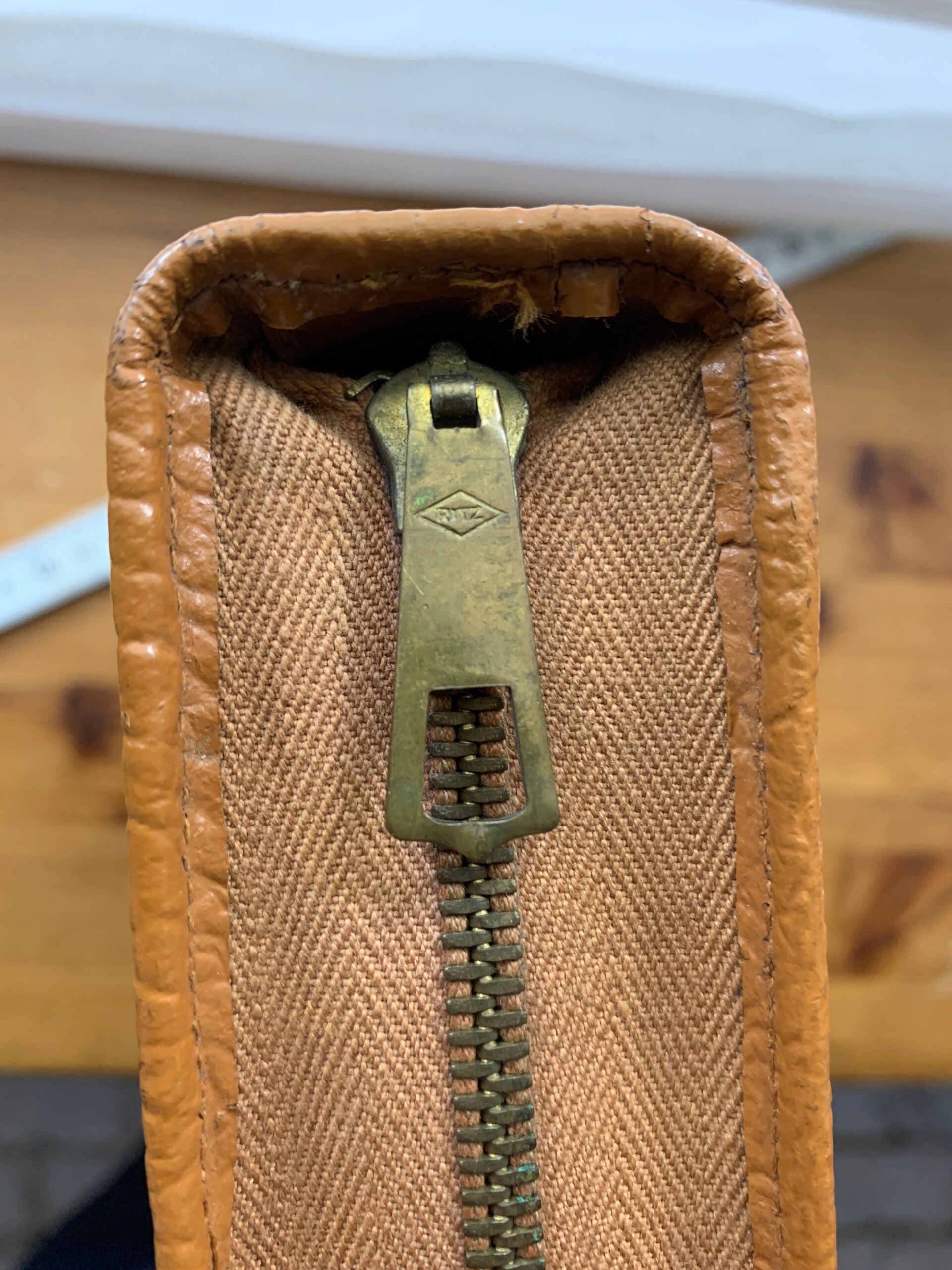 In de leren etui zitten een spiegel met kam, een metalen schoenlepel, een houten kledingborstel, een zeepdoos met verchroomd deksel, een scheerkwast in verchroomde houder, een verchroomde zeepstaaf houder en een scheermes. De set heeft een mooie vintage conditie die past bij de leeftijd. De rits is van het merk RITZ die bekend stond om hun metalen ritssluitingen uit de jaren '30-'50.