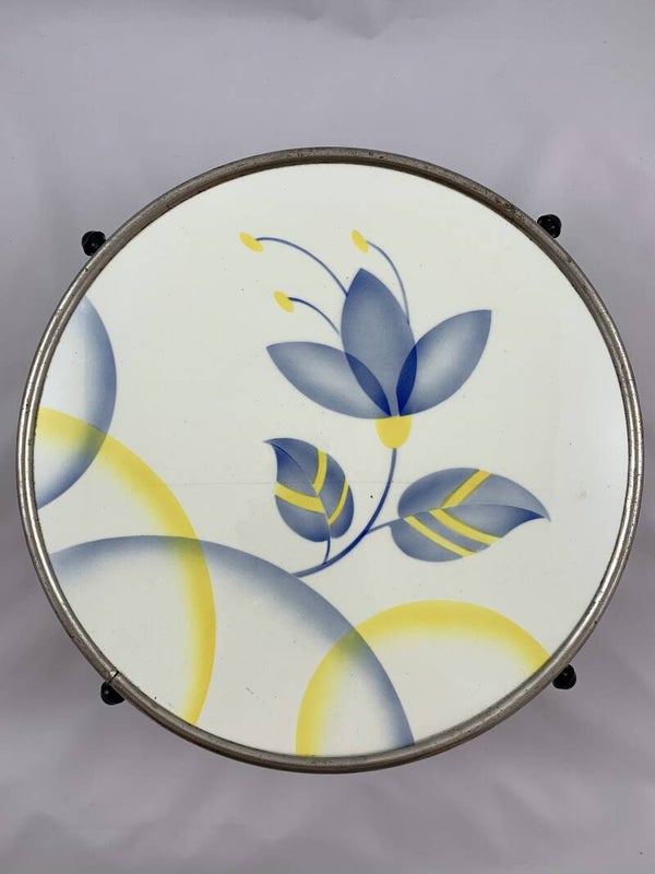 De voet is metaal/zilverkleurig en de schaal is een draaibare porseleinen bovenplaat. De bovenplaat is gedecoreerd met een vrolijk blauw-geel-wit bloemmotief. De hele schaal heeft een mooi doorleefd vintage uiterlijk wat recht doet aan de tijd.